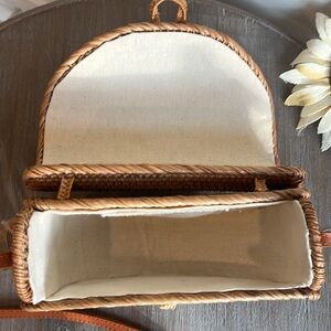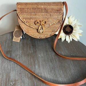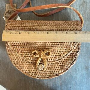 Brand new handcrafted natural rattan flap over cross body saddle bag. Lined interior. Adorable!