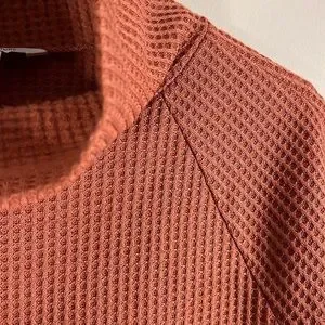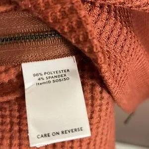 L.L. Bean long sleeve waffle knit mock neck top with front zipper detail in a warm clay color with a slightly pink/peach hue - inside is soft fleece - great used condition - pit to pit is 20.5” - length from highest shoulder is 28.5” (nice length to wear with leggings - #B7-C