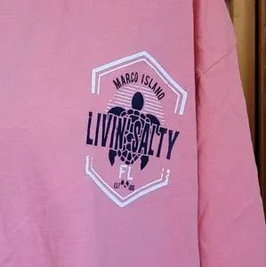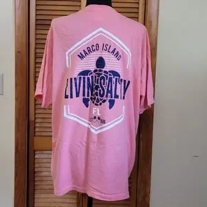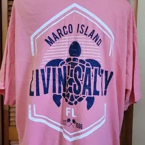 never worn, excellent condition, Marco Island, FL distressed logo on front and back of shirt, 100% cotton, salmon pink color