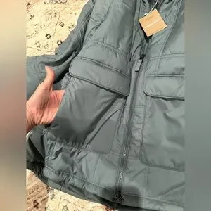 Cozy and stylish Patagonia puffer coat in a beautiful blue/teal shade. New with tags and perfect for chilly days! Features a hood, five pockets (four front pockets + one internal chest pocket), and a quilted design for warmth and style. Relaxed, boxy, hip-length fit ideal for layering — consider sizing down if you prefer a slimmer fit.