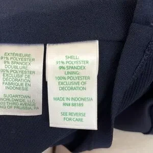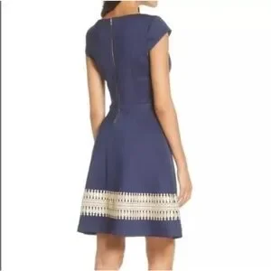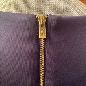 Gorgeous dress, excellent condition. Fit and Flare style Navy dress, exposed gold zipper with wide gold trim at bottom. Cap sleeves. Fully lined, washable