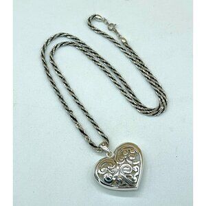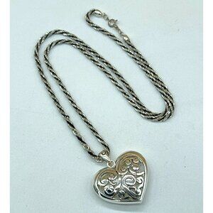Puffy Heart Necklace Silver Tone Open Work Scroll Design Black Silver Rope Chain