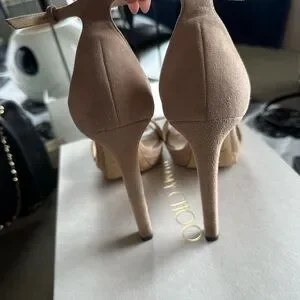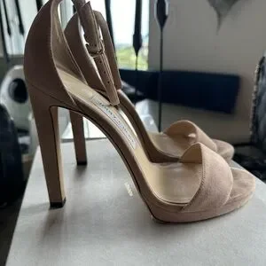 Beautiful Jimmy Choo pink suede Misty heels in a size 38 worn twice come with dust bag and box please note in great condition small little discoloring on the bottom of of the back of the heels just from normal wear can probably be taken out that cobbler