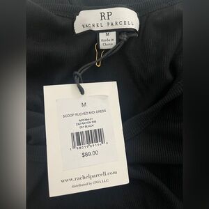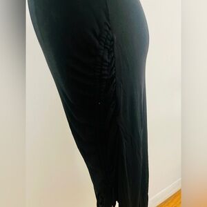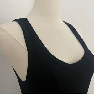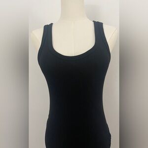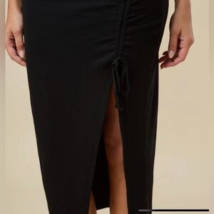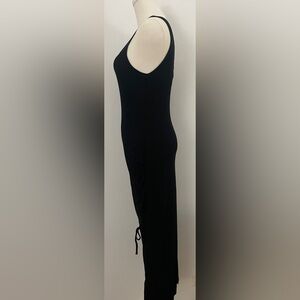 This ribbed super soft midi tank dress has a scooped neckline and an adjustable ruched tie that leads to a front slit.