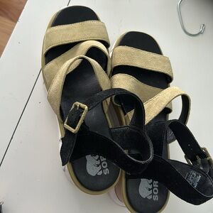 Sorel sz 9.5 platform/wedge sandal. Too is a soft sage green suede and ankle strap is black suede. Very comfortable worn only a few times.