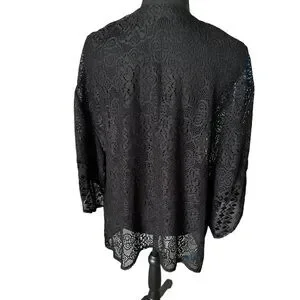 This is a really pretty kimono or coverup from Hollister, one size. It is black and the fabric is crochet with burnout velvet on the sleeves and front. It is in excellent condition, only worn once.