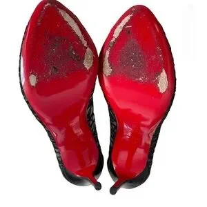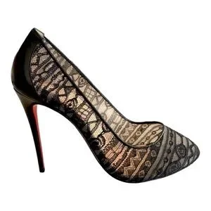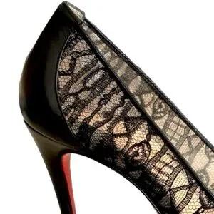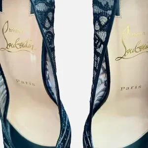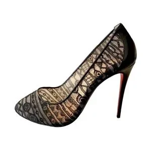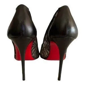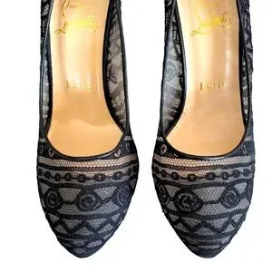 Christian Louboutin Dorissima Black Lace Leather Round Toe Stiletto Heels Pumps in very good preowned condition.
