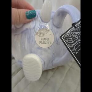This unique figural mug features a spooky monster design in purple, perfect for Halloween. The mug is made of high-quality ceramic and porcelain materials, hand-painted with intricate details. It is suitable for hot beverages and comes with a service for one.