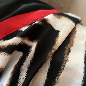 JM collection size medium tunic, animal print and red. So beautiful, soft and feels like silk. I wore with legging and boots. So nice!