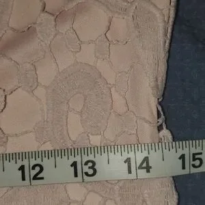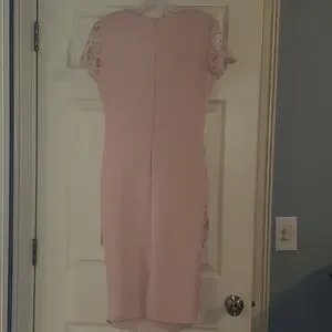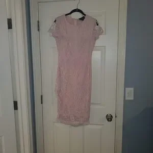 Women's crochet lace midi pink blush sheath dress. Very feminine crochet front dress for any season with cap sleeve and midi length. 100% polyester. See pics for all measurements and feel free to ask any questions. Worn once and clean and ready to wear. US size 8 UK size 12.