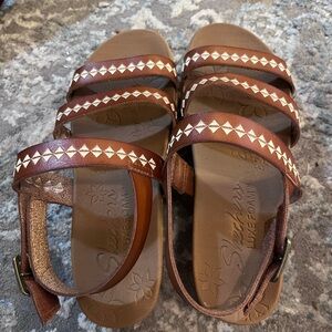 Skechers Luxe Foam 2” platform wedge with velcro closing strap. Only worn a couple of times. Brown with white diamond embroidered shapes.