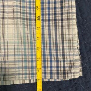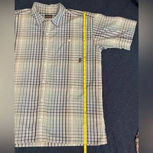 Nice Crisp button up shirt. EUC. Slightly textured material. Light blue, royal blue and navy blue color combo. Size tag missing, see photos for measurements.