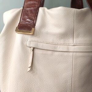 Tote is white leather but may appear cream in photos. Brown leather has a distressed appearance.