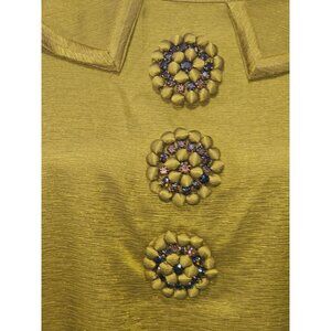 This exquisite vintage gold satin dress is an embodiment of elegance and timeless fashion. The dress features intricate beaded floral embellishments on the front, adding a touch of sophistication. The short sleeves and flattering fit make it suitable for various occasions. Crafted with meticulous attention to detail, this dress stands out as a classic piece in any wardrobe.