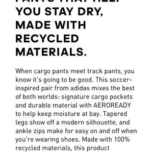 When cargo pants meet track pants, you know it's going to be good. This soccer-inspired pair from adidas mixes the best of both worlds: signature cargo pockets and durable material with AEROREADY to help keep moisture at bay. Tapered legs show off a modern silhouette, and ankle zips make for easy on and off when you're wearing shoes. Made with 100% recycled materials.