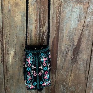 - and it's a perfect gift for the free spirit in your life. NWOT, never used, free of stains or scents. Lining and bottom of bag are absolutely untouched! Beautiful Embroidered embellishment, braided strap, draw string closure, tassels with silver bead. Imported.