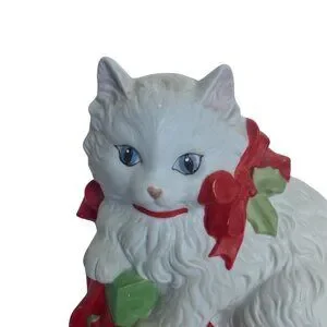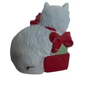Charming 1990 holiday figurine by Enesco, designed by G.G. Santiago. Features a white cat with a red bow, seated on red and green presents.