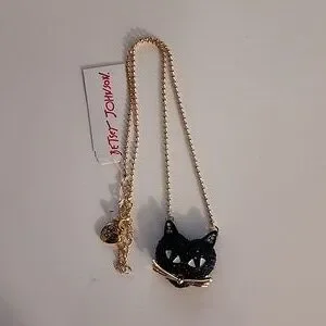 Betsy Johnson Black Cat Pavé Stone Gold tone ball chain necklace w lobster clasp
