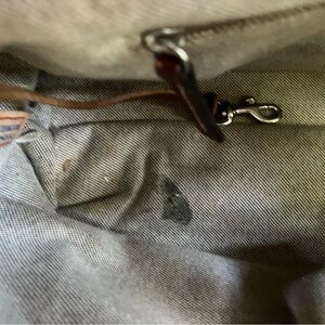 ! Fabric and leather Dooney and Burke handbag. Had leather covered pockets on the front. Has a leather covered zipper in back. Leather handles, no long strap. About 10 x 11 inches. Beautiful striking bag.