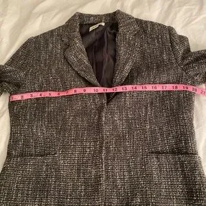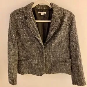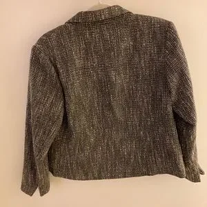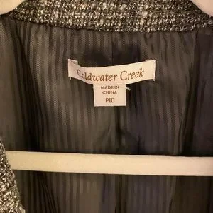 Coldwater Creek gray blazer/jacket. Size 10 petite. Polyester/wool. Silver sparkle thread throughout tweed pattern. Notched Cuff and Collar. In great condition. Looks great on!