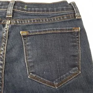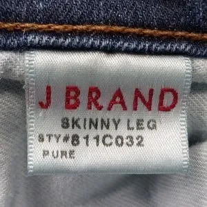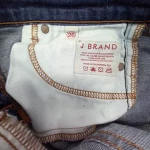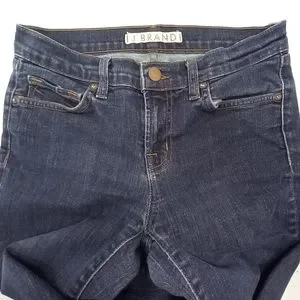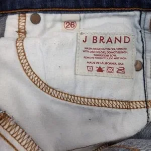 WornButNotWornOut J Brand Pure Skinny Leg jeans size 26: waist 28" across/ rise 8"/ inseam 27"/ leg opening 5.25" across. Midweight soft stretchy navy blue denim 92% cotton/ 7% polyester/ 2% Spandex. Fabric relaxed, naturally distressed, still good form & feel. Slight wear high on inner seam, no holes or tears. Freshly washed, some wear to pocket fabric. See all pics, priced accordingly. Trendy comfy J Brand!