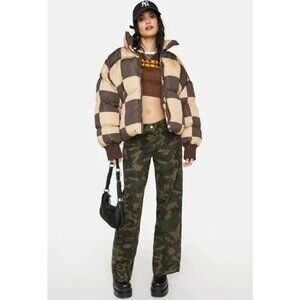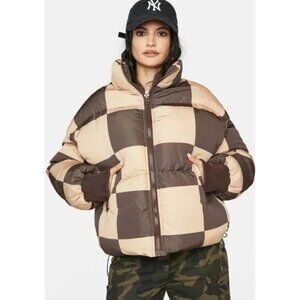 Edikted Checkerboard Puffer Jacket Womens Size S Brown & Beige Zipper Closure