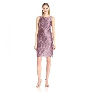 Employ classic elegance into your ho-hum wardrobe as you look utterly feminine in this stunning Adrianna Papell creation. Designed with embroidered lace on a sculpted silhouette, this captivating piece shows off a bateau neckline paired with a v-cut open back on a sleeveless bodice. Divinely skimming from the natural waist with seams, the sheath skirt pours down to a lovely short hemline. Tailored with round shoulders and loose quarter sleeve, the taffeta topper reveals a collarless and buttoned-down knee length accents on its sleek ensemble. Revel in a megawatt style that exudes Parisian flair in this Adrianna Papell masterpiece. Model is wearing the Dusty Pink color.
