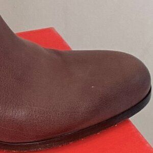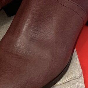 See last 3 photos: There are a couple of faint small spots/wear on the side of the vamp and toe areas of left boot and outside of right boot.