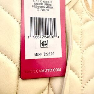 New with tags. Final sale. Price Reduced from $228 retail. Huge bargain. VINCE CAMUTO ARTISAN INSPIRED QUILTED Lamb Skin tote, THE PERFECT NEUTRAL IN FIREFALL. Luxurious with logo charm on one side and logo plate on the other side. Magnetic closure, one zipper pocket with media pocket and two other pockets. SEE CHAIN ACROSS CLOSURE. GENUINE LEATHER. I ship on Wednesdays and Saturdays.