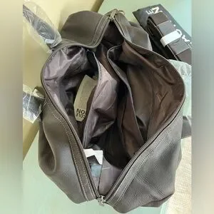 Large main compartment includes multiple zippered interior organizer pockets. Quick access front and back pockets. Padded removable shoulder strap. Includes genuine full grain leather identification tag. Includes signature Kenneth Cole® hardware and lining.