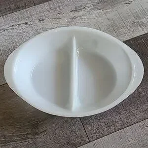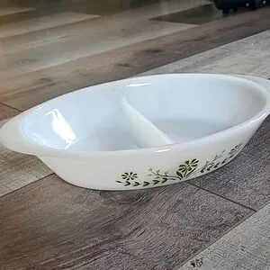 Adorable divided vintage casserole dish from Glasbake. Has green floral pattern. This dish is amazing condition except for one small defect. Not sure if it's a hairline crack or a manufacturing defect as it follows the edge. (see pics) A wonderful piece to add to your kitchen.
