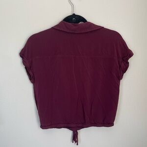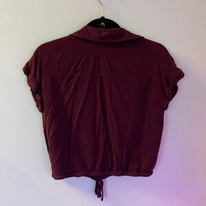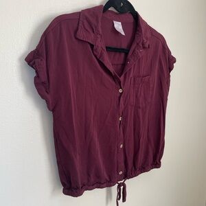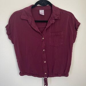 Short sleeve button top in burgundy. Cuffed sleeves. Slightly cropped, with tie at waist. Size small. Gently used.
