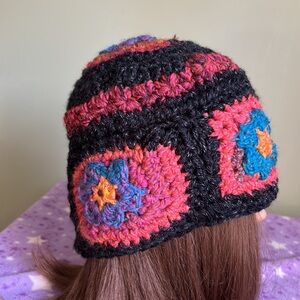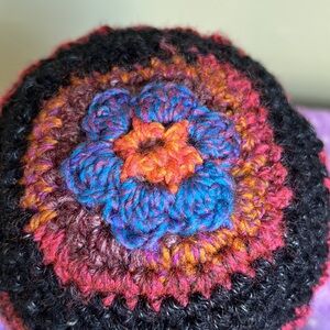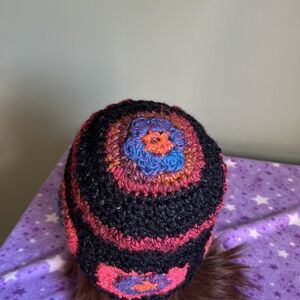 Crochet handmade acrylic yarn flowers beanie clean never worn new. Warmest winter hat wash suggestion in cloth laundry bag or tied sock to prevent piling fuzz and maintain form.