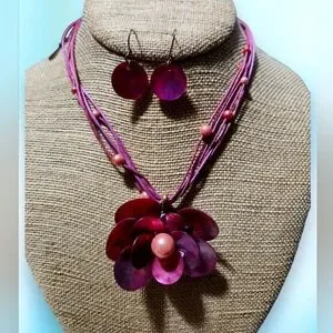 New Purple Flower Shell Necklace Earrings Set. Necklace Length measures 17". Earrings measure 1/2". Copper accessories.