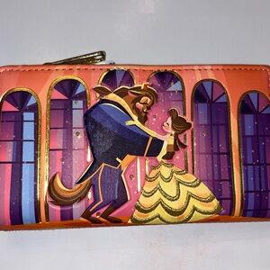 Beauty and the Beast wallet. Metal loungefly. Holds 8 cards with plenty of room in the back for cash and additional cards. Side zipper for change. No rips.