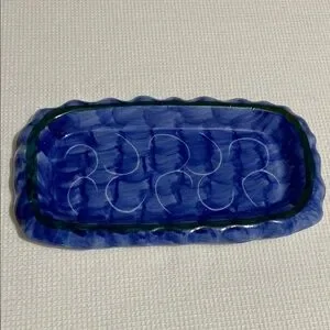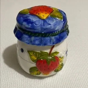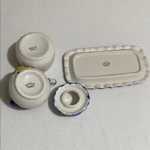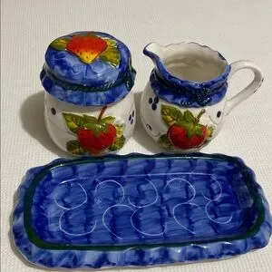 Strawberry design sugar and creamer set with blue tray.