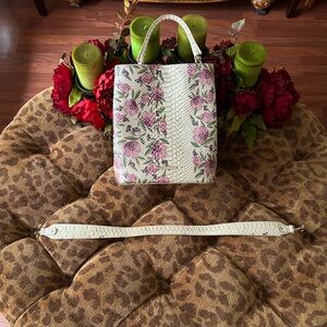 Gently used Brahmin Amelia Labyrinth Handbag with minor signs of usage. The luxurious and striking flower pattern has different shades of a lavender purple and lilac on croc embossed leather. Convertible straps: Has a single handle strap and a detachable shoulder strap, gold tone hardware, fully lined, footed bottom, Brahmin hang tag, interior zip pocket, two slip pockets, pen pocket, key clip, magnetic on the tab/bridge closure. This perfectly sized bag keeps your essentials well organized with its three sections, with the middle/center section being a secure zippered pocket section. Measures approximately 9”W x 10.5” H x 5.5” D. Please look at the photos and feel free to ask questions or ask for more photos. I’m happy to provide additional information if you have any questions. This is a high quality investment and statement piece. When carried, I would get stopped and asked where I purchased it! Sadly, I own too many handbags, so will be selling a few of my high-end designer bags.