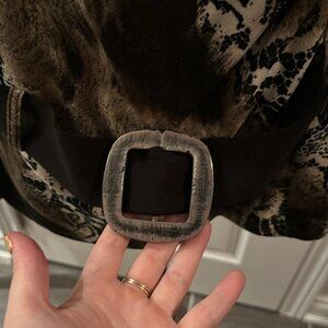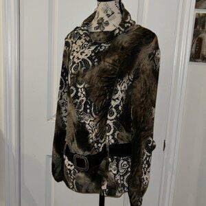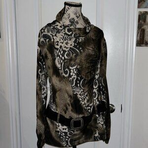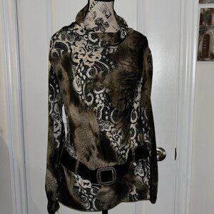 Very good preowned condition. Made in Canada. Size 14. Stretchy and comfortable. Cowl neck style. Attached belt detailing at front.