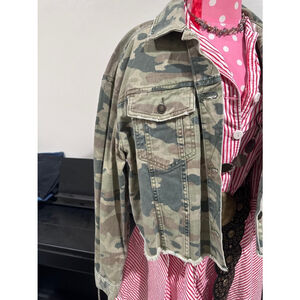This is a new, never worn, Free People camo denim jacket. It is a cropped style with a raw hem and features a classic denim jacket silhouette with two front pockets and a button closure. The jacket is made of a soft, lightweight denim fabric and is in excellent condition. It has a relaxed fit and is perfect for layering over dresses or shirts. The jacket is a size small and measures approximately 19 inches from shoulder to hem and 17 inches from pit to pit. The jacket is in new condition without tags or box.