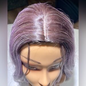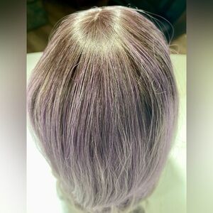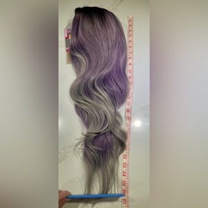 Brand new, never worn, nice, full, bouncy hair, center part, light layering, tendrils at front. See pics and video. So pretty for a change but not too shocking or tacky looking with lavender/lilac/light purple nicely balanced by brown and gray. I ship every day.