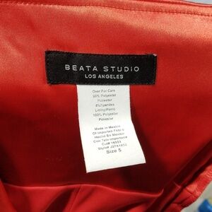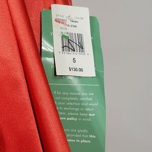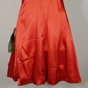strapless w/ sweetheart neckline. ruffle detail down left front side. slight bubble hem. silky/sateen feeling fabric. Gorgeous! MSRP $130.00