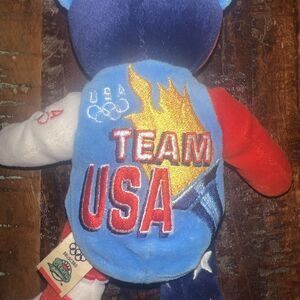 This Team USA Olympics Authentic Team Beans Bear is a rare and unique item that any sports fan would love to add to their collection. With its patriotic colors of red, white, and blue, this bear represents the USA team at the 2000 Olympics. The bear is made by Team Beans and is an officially licensed product of the Olympics.