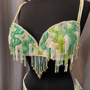 Older pictures of me in the costume show white chiffon accent pieces that are now teal and green (I will include the extra fabric that was not used). There is some dirt on the bottom of the skirt and the inside of the bra shows tanning stains. Cups are currently not padded. Length can be altered as there is no beading along the bottom seam.