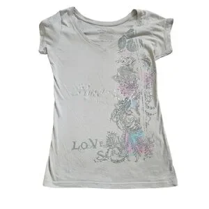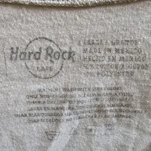 Hard Rock Cafe Cancun gray t-shirt with silver metallic script. Size large runs small: measures 18" flat underarms 15" waist 17" hips. 50% algodon 50% polyester, machine wash and dry. In good condition, minor pilling.