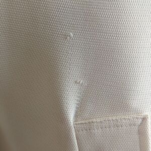 It has a few picks above and below the left pocket. I show 3 close ups, then a little further away to show that they are not that noticeable unless you are up close looking for them.