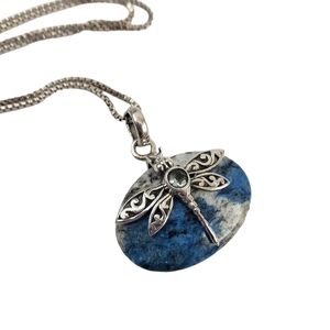 Blue azurite in quartz dragonfly pendant necklace set in sterling silver. Dragonfly pendant is embellished with a faceted blue topaz gemstone. Solid sterling silver chain. 18 inch chain. Pendant features artisan details. Chain and pendant are stamped 925. This is a new item and has never been worn. Handmade artisan jewelry. All photos were taken by me and are of actual item.