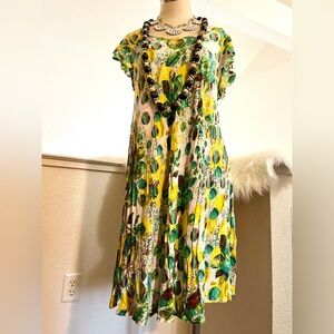 EUC L vintage y2k, likely older, Jams World yellow green very very collectible midi dress!!! I’m soo soo excited to introduce this one!! Bold and vibrant colors! Made in Hawaii!! I did a lot of research on this to understand the brand and try to date the tag. Unfortunately, there isn’t much information, but I believe this one is from the 90s. Super cute story on how they got started! Soft rayon material. Lightweight as well!! Only a limited number are made!! This is why they are now rare!! I have seen some priced around $400 for certain Uber rare garments!! I have not seen this pattern listed online!! Measures 20.5” across the bust, little stretch to 25”. Shoulder to hem is 39”. All measurements are appropriate. I think this would be considered a midi shift dress, but I’m not sure on my vocabulary on this one… lol. This listing is for the dress only. Necklaces sold separately or can be added to the listing, upon request. I included a little history of the brand to enjoy and to understand why the brand is so loved and treasured! 🤩