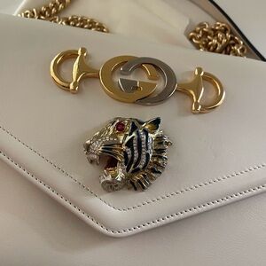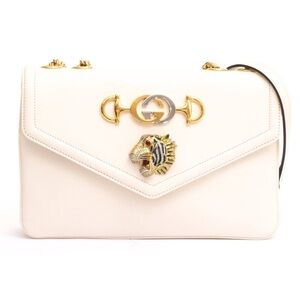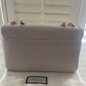 Made in Italy. Creamy, off-white leather with gold metal detail. One interior open pocket and one interior zippered pocket. Can be worn as a shoulder bag or cross-body bag. Includes original dust bag and receipt.
