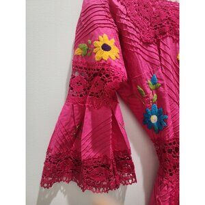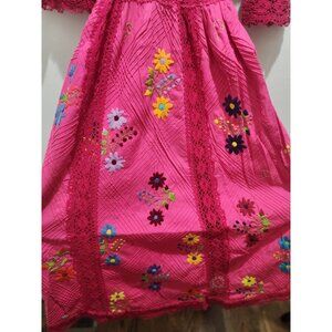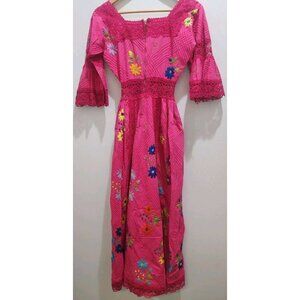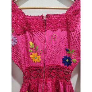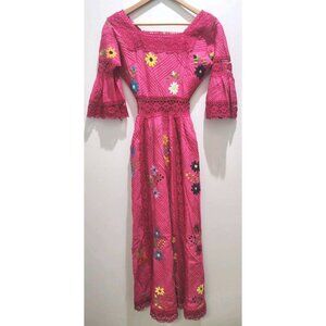 Stunning VTG MEXICAN OAXACA WEDDING PENTUCK Pink Lace FLORAL EMBROIDERY Dress XS