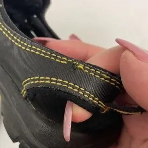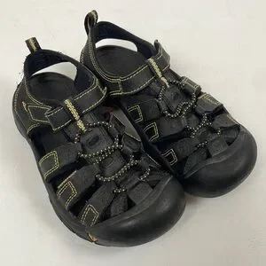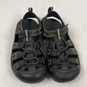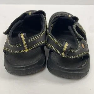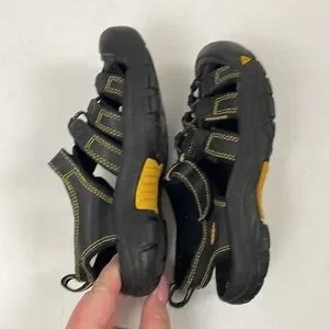 Preowned condition Structurally sound black and yellow hiking walking beach shoes with hook and loop closure see last photo for flaw does not effect usability